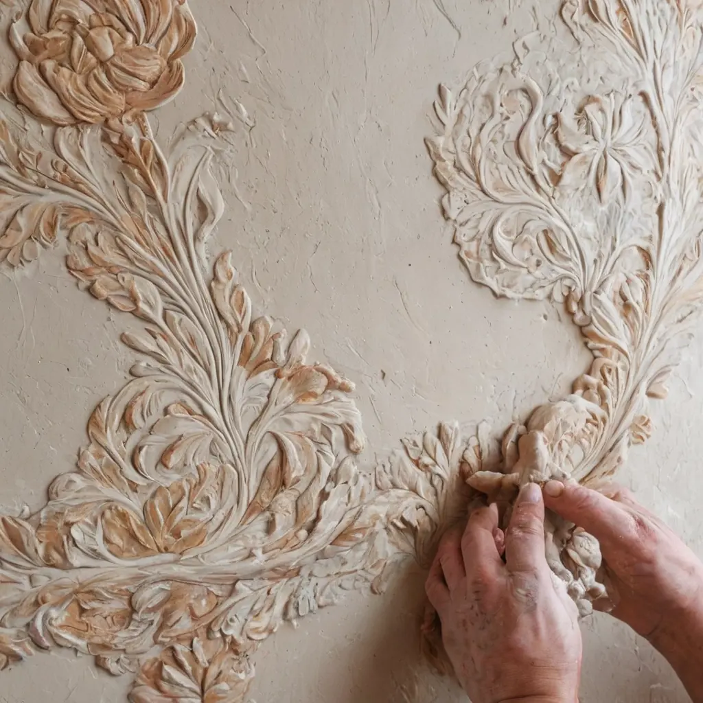 - Сформировать фактуру: штрихование шпателем, круговые движения кельмой, оттиски губкой или использование трафаретов.